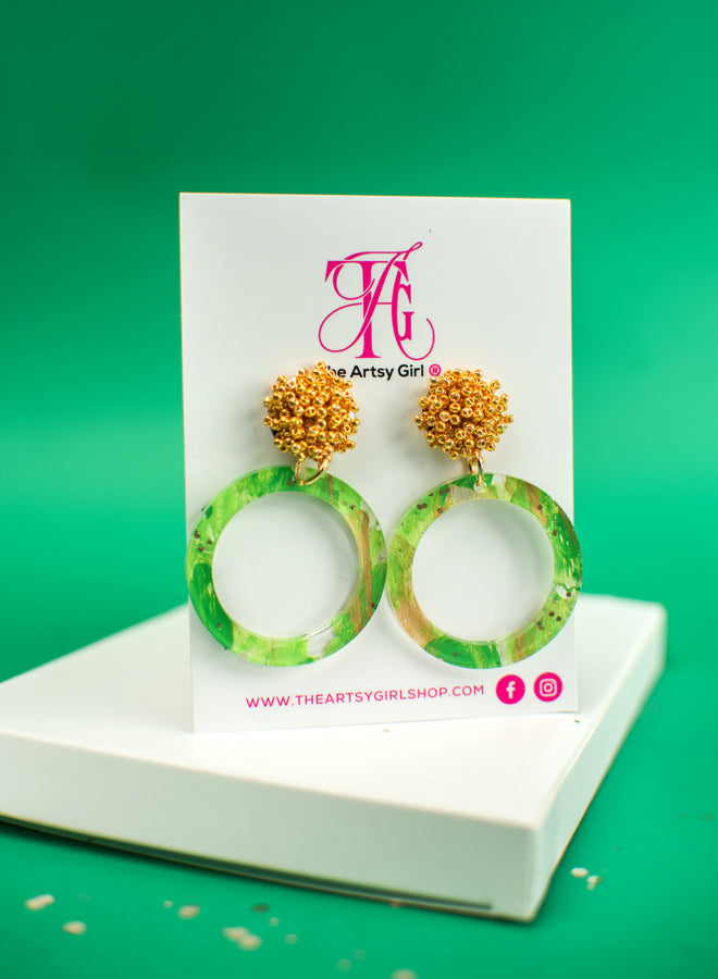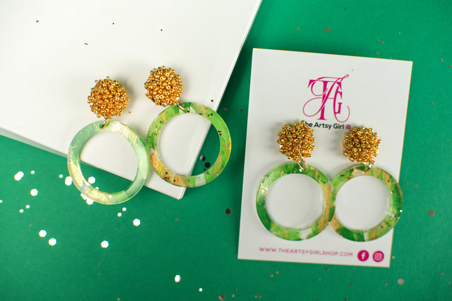 - Dangling Hand-painted circles, filled with captivating glitter that catches the light with every move.