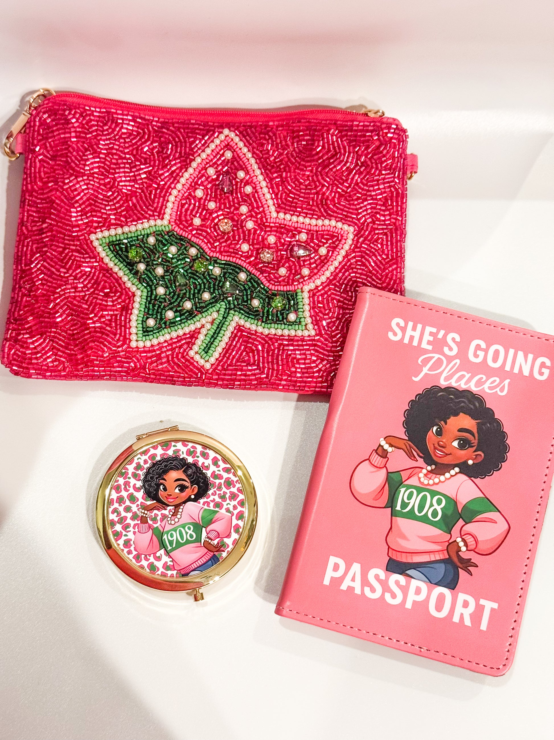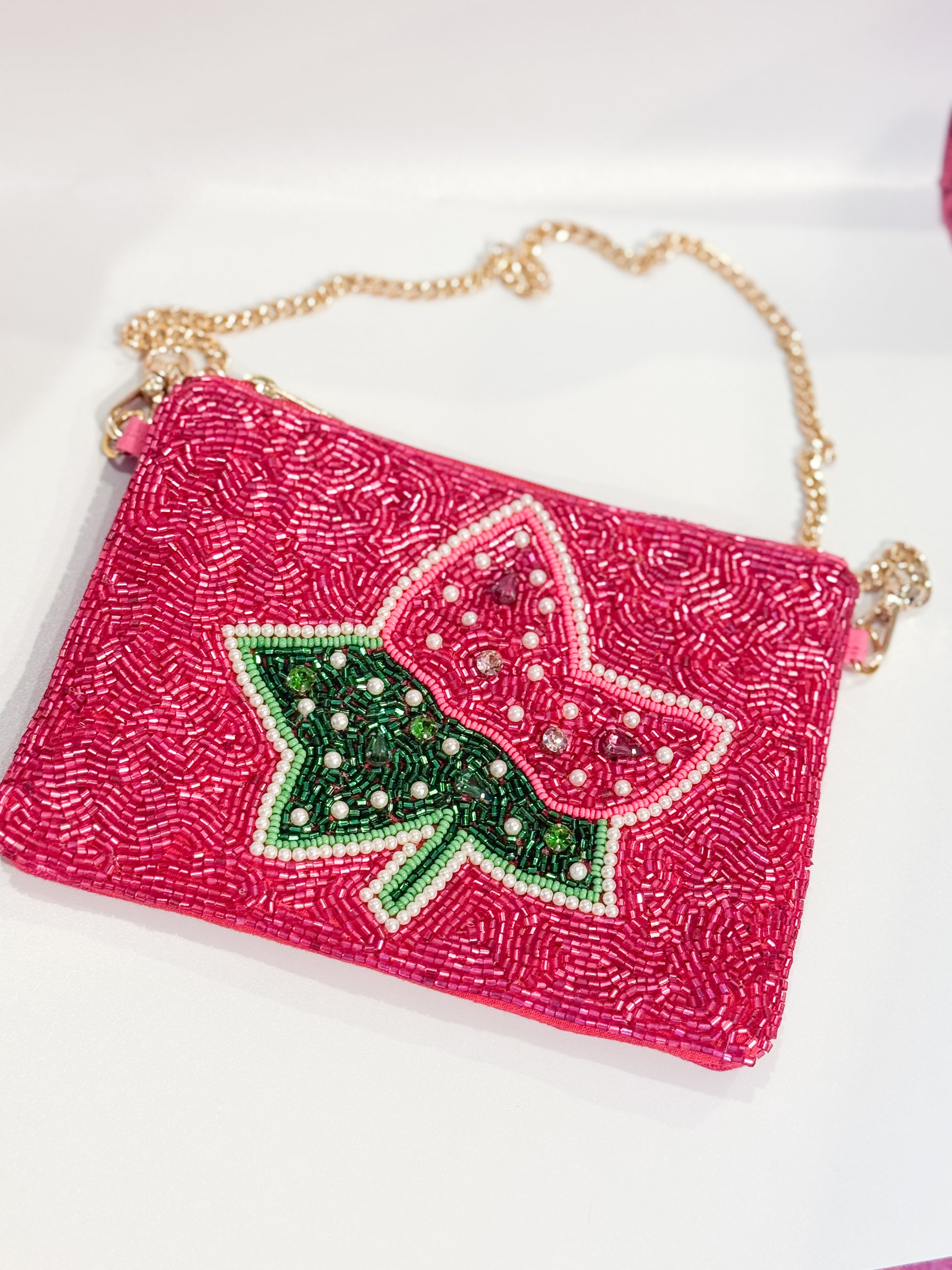 Pretty meets powerful with our Girlie Girl Clutch! This dazzling beaded statement piece features a bold pink and green ivy design that pops against a rich hot pink background. Hand-sewn with intricate seed beads, pearls, and rhinestones, this clutch is perfect for the woman who loves to shine while keeping it classy. The detachable gold chain strap adds a touch of glam and makes it easy to wear as a crossbody or carry as a clutch. Whether you’re headed to brunch, a conference, or a special celebration, this clutch brings the sparkle—and the sisterhood energy—with you.