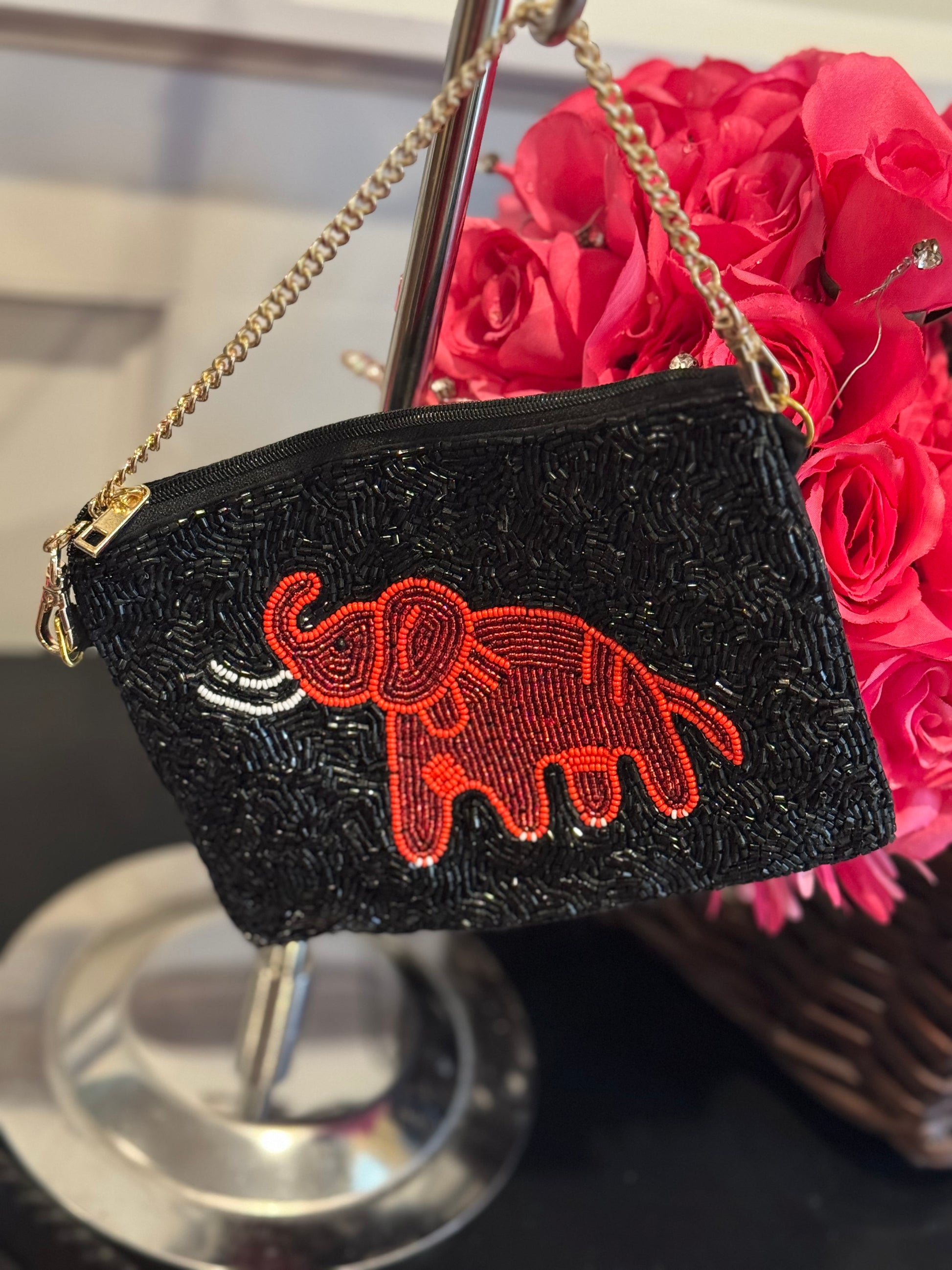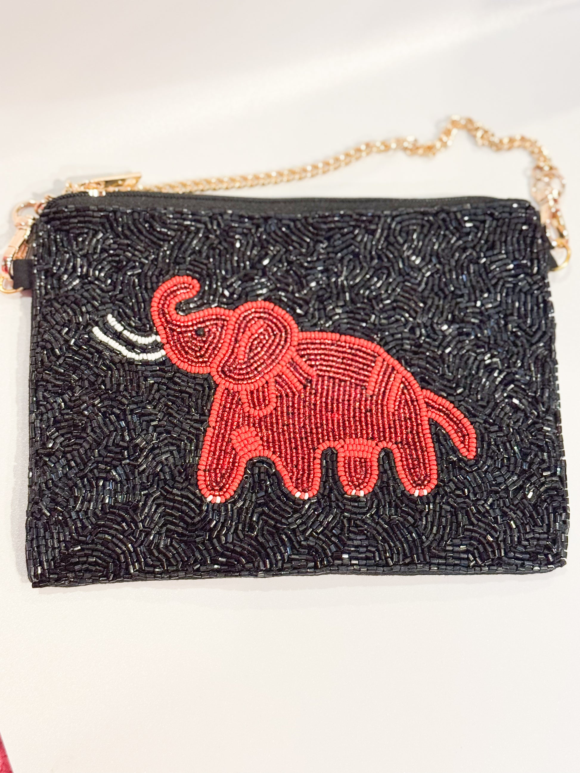 - Fully hand-beaded front with red elephant and black seed beads