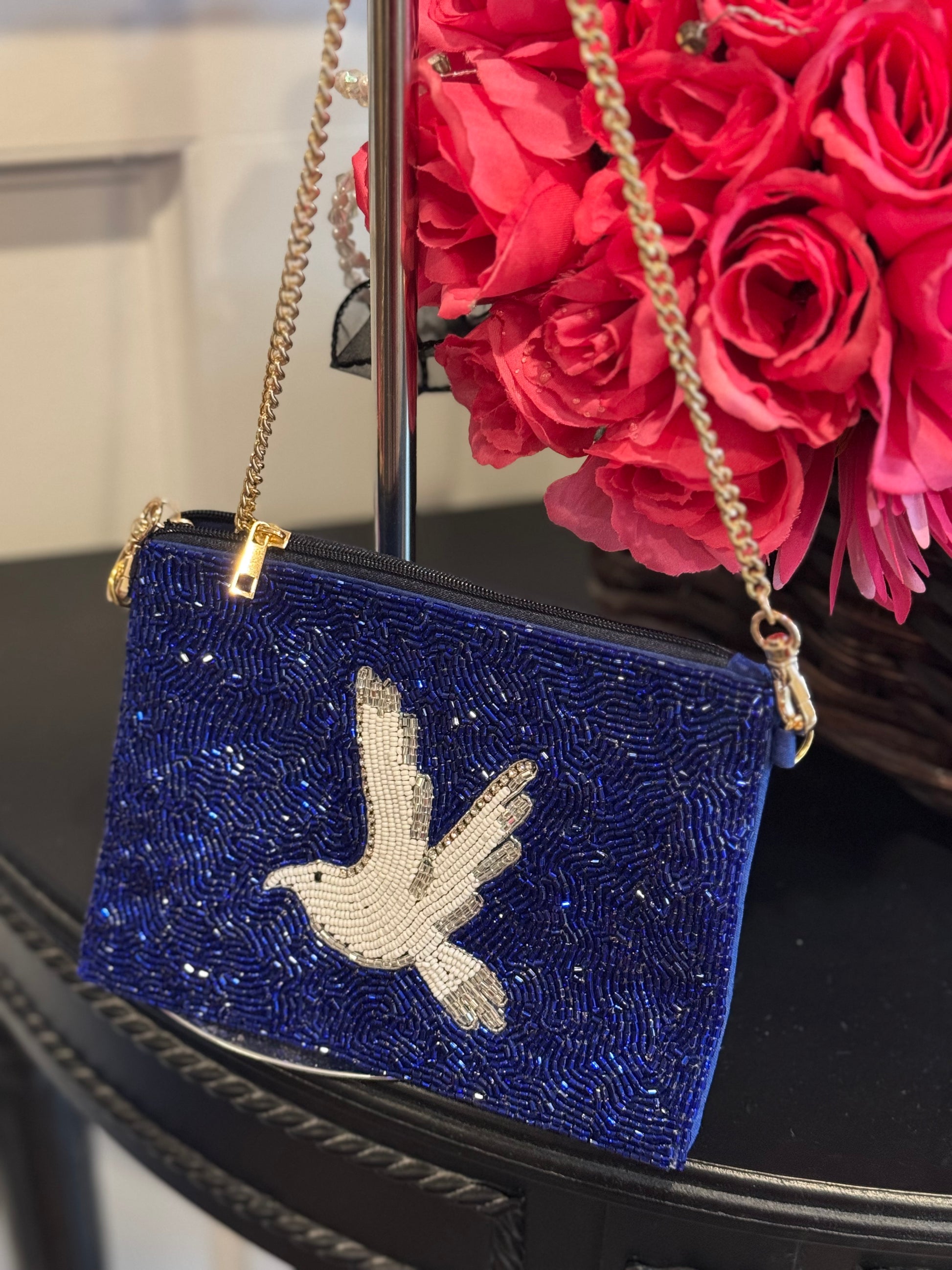 Bold, elegant, and full of grace—the Girlie Girl Clutch in royal blue brings sparkle with a message. This hand-beaded beauty features a radiant white dove in flight, symbolizing peace, purpose, and power. Set against a rich, shimmering navy backdrop and finished with a detachable gold chain strap, this clutch is perfect for events where you want to stand out and stay true to your values. From conferences to classy brunches, this piece adds a graceful edge to your outfit while holding your essentials in style.