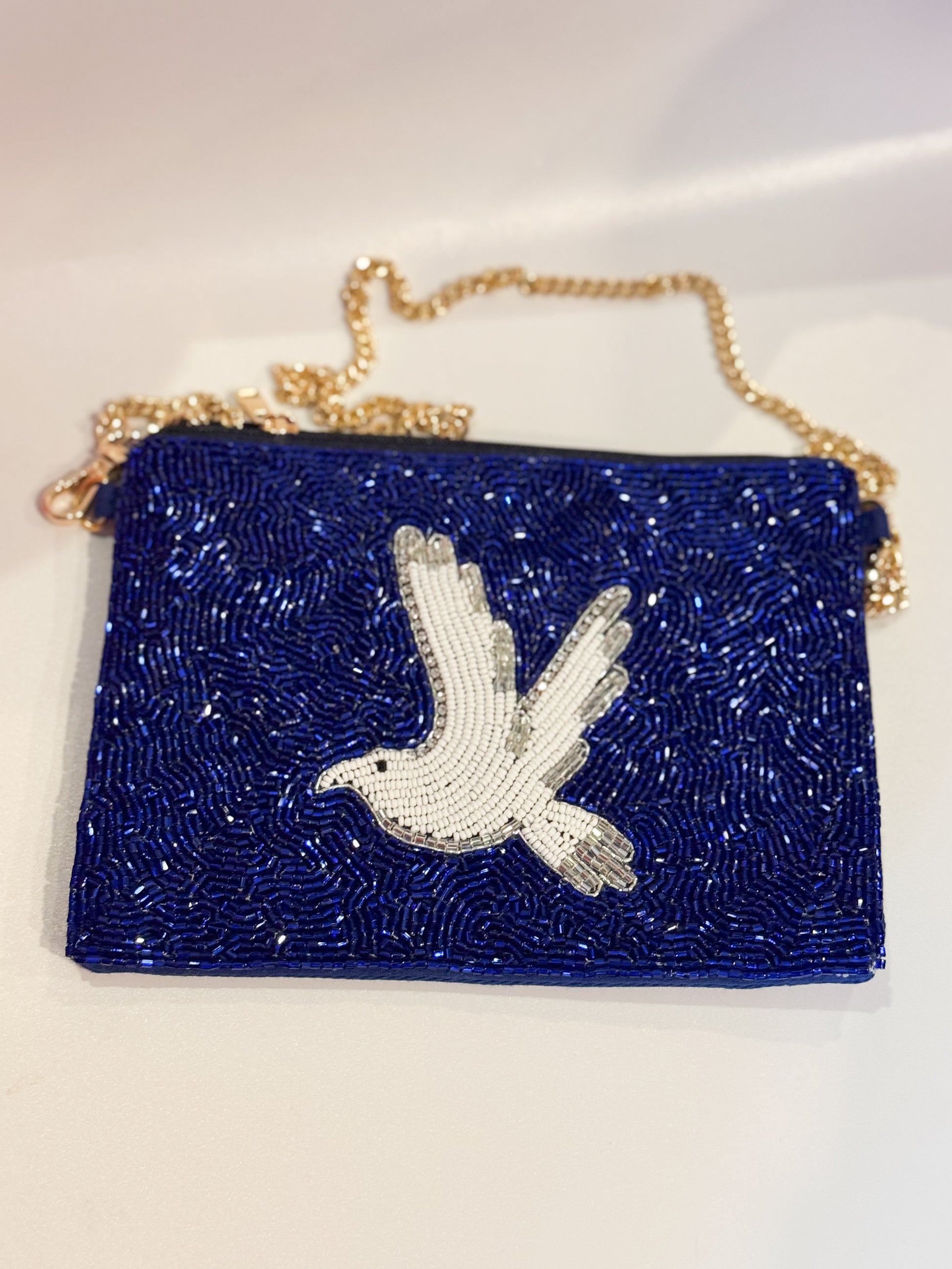 - Fully hand-beaded with white and silver dove motif on a blue background