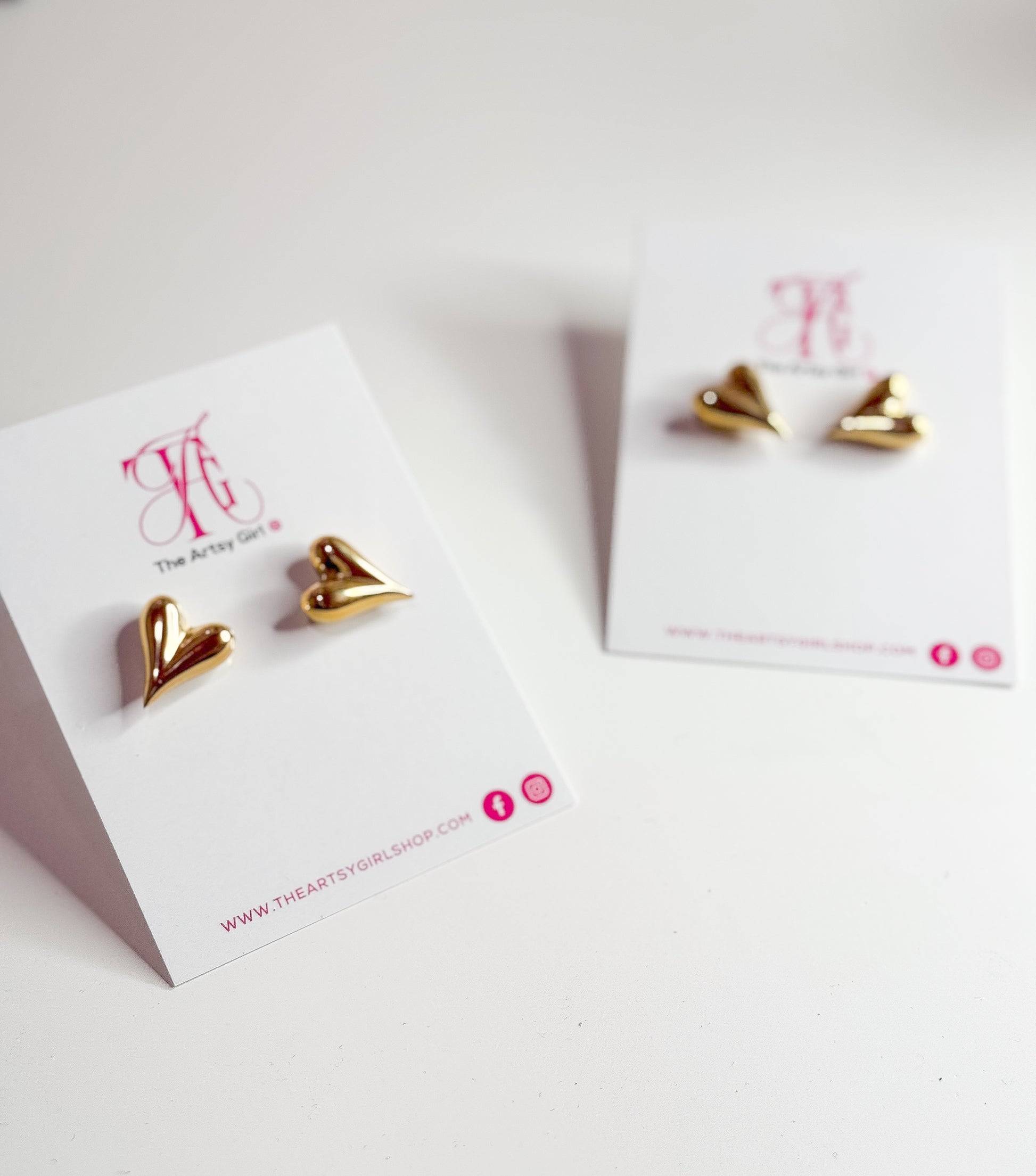 These tarnish-free gold heart-shaped studs are designed to shine as brightly as your love, encased in a sleek, bubble-like finish that captures elegance and simplicity. Perfect for everyday wear or as a sentimental gift.