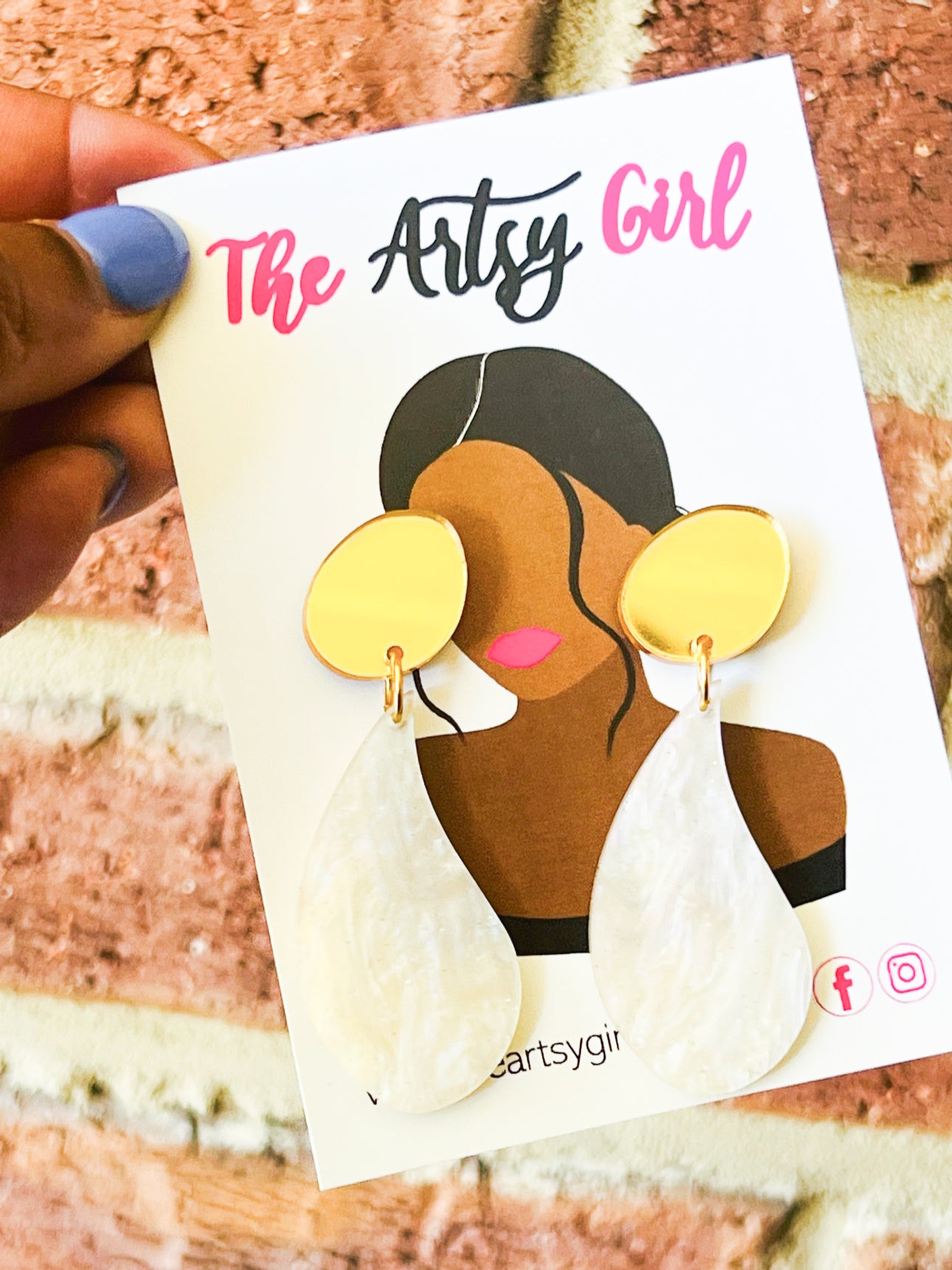 Elevate your style and self-love with the "Loving On Me" Ivory & Gold earrings. Crafted with high-quality materials, these earrings feature a mirrored stud for confidence and a hand-drawn shape for artistic flair. Wear them as a reminder to prioritize self-care and embrace your unique beauty. Perfect for any occasion, these earrings effortlessly blend boldness and grace for a truly empowering accessory.