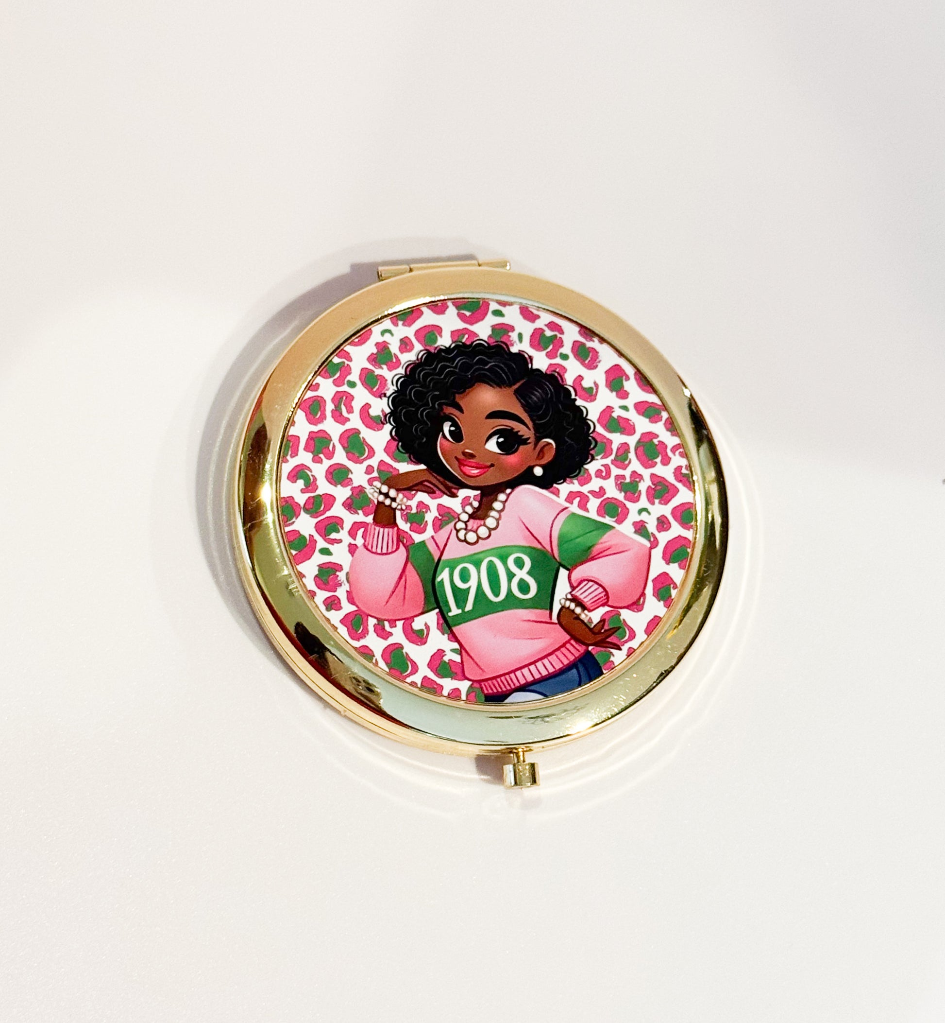 Bold. Beautiful. Unapologetically you. Our Mirror Reflections pocket mirror features a stunning illustration of a confident queen rocking pink and green with “1908” proudly displayed—set against a fierce pink leopard print background. Framed in a sleek gold compact, this mirror is perfect for on-the-go touch-ups and sparkle checks. Whether you’re reapplying your favorite gloss or just reminding yourself how fabulous you are, this mirror is a must-have for any handbag, makeup pouch, or sorority sister on the move.