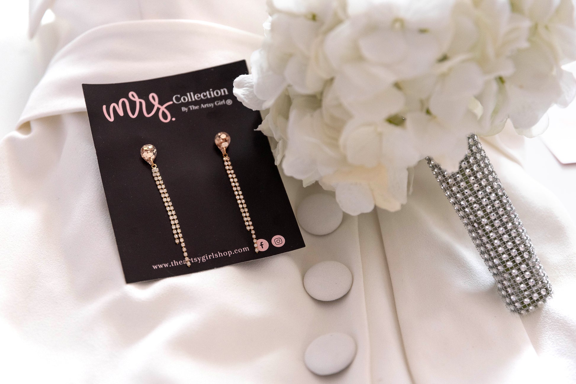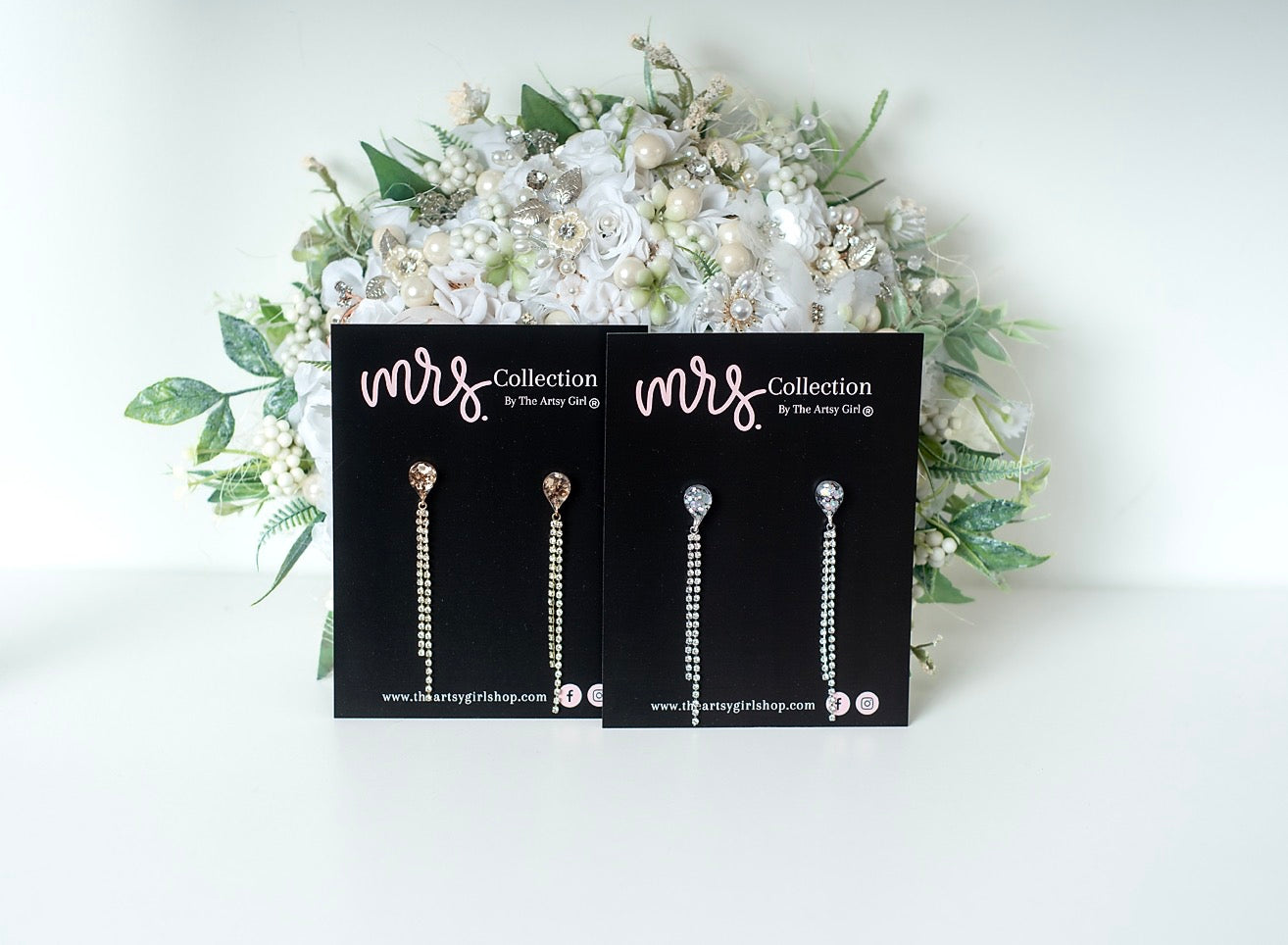 Elevate your wedding day look with our exquisite “My Forever” earrings for the bride, mother of the bride or the wedding party. These stunning pieces feature a delicate teardrop stud, elegantly suspended from two strings of glistening small rhinestones. The intricate design captures the essence of romance and sophistication, making them the perfect accessory for your special day. With “My Forever” earrings, you’ll cherish not only the moment but also the timeless beauty they bring to your wedding day. Make your forever truly unforgettable.