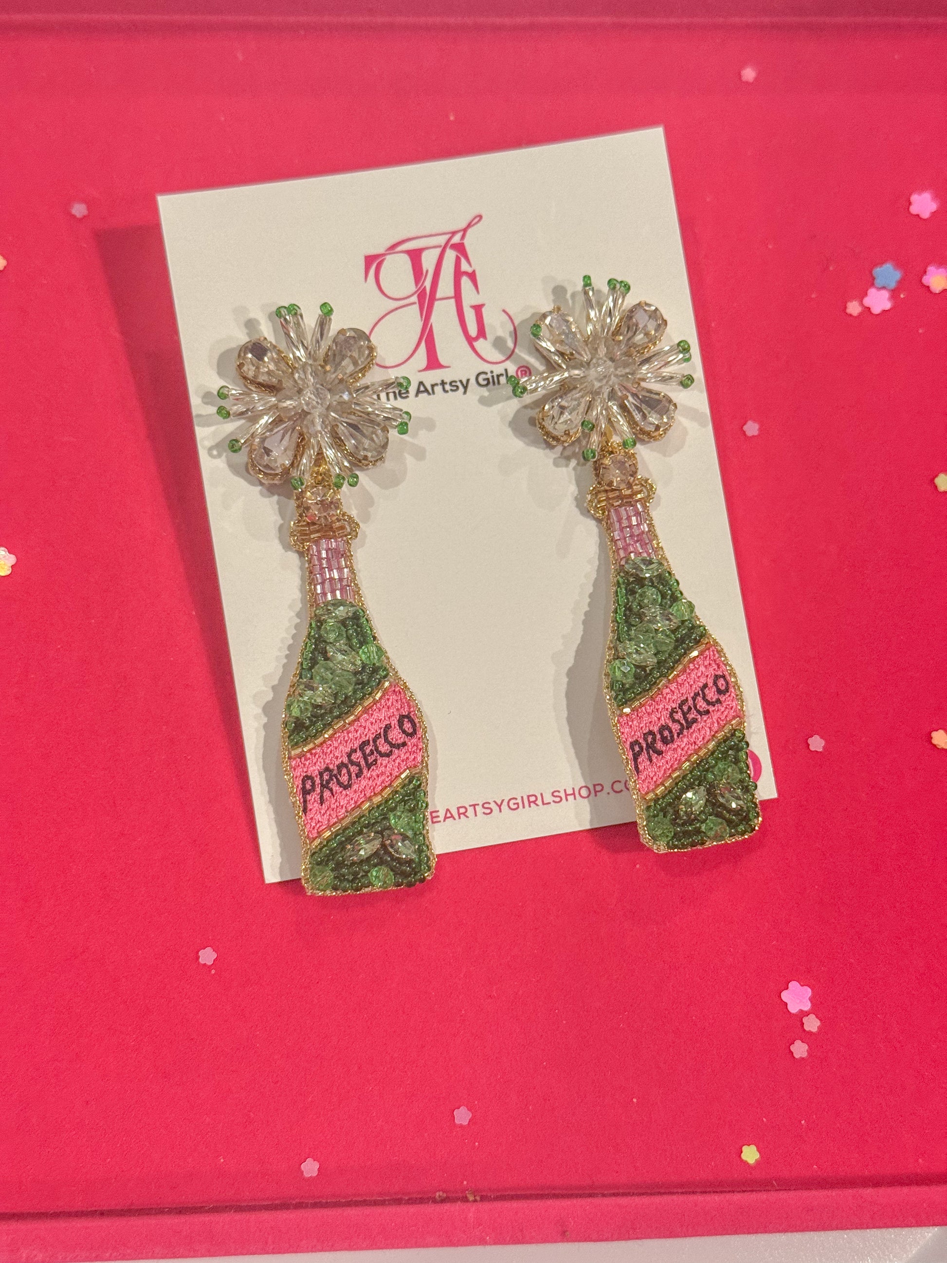 Let the celebration begin—sparkle edition! Our Poppin’ Sparkles earrings in pink and green are a bubbly dream come true. These dazzling hand-beaded earrings feature glittery Prosecco bottles bursting with crystal “champagne fizz” at the top, giving your outfit instant party energy. Perfect for brunches, chapter events, girl’s nights, or whenever you’re feeling extra, these earrings are made to be seen and celebrated.