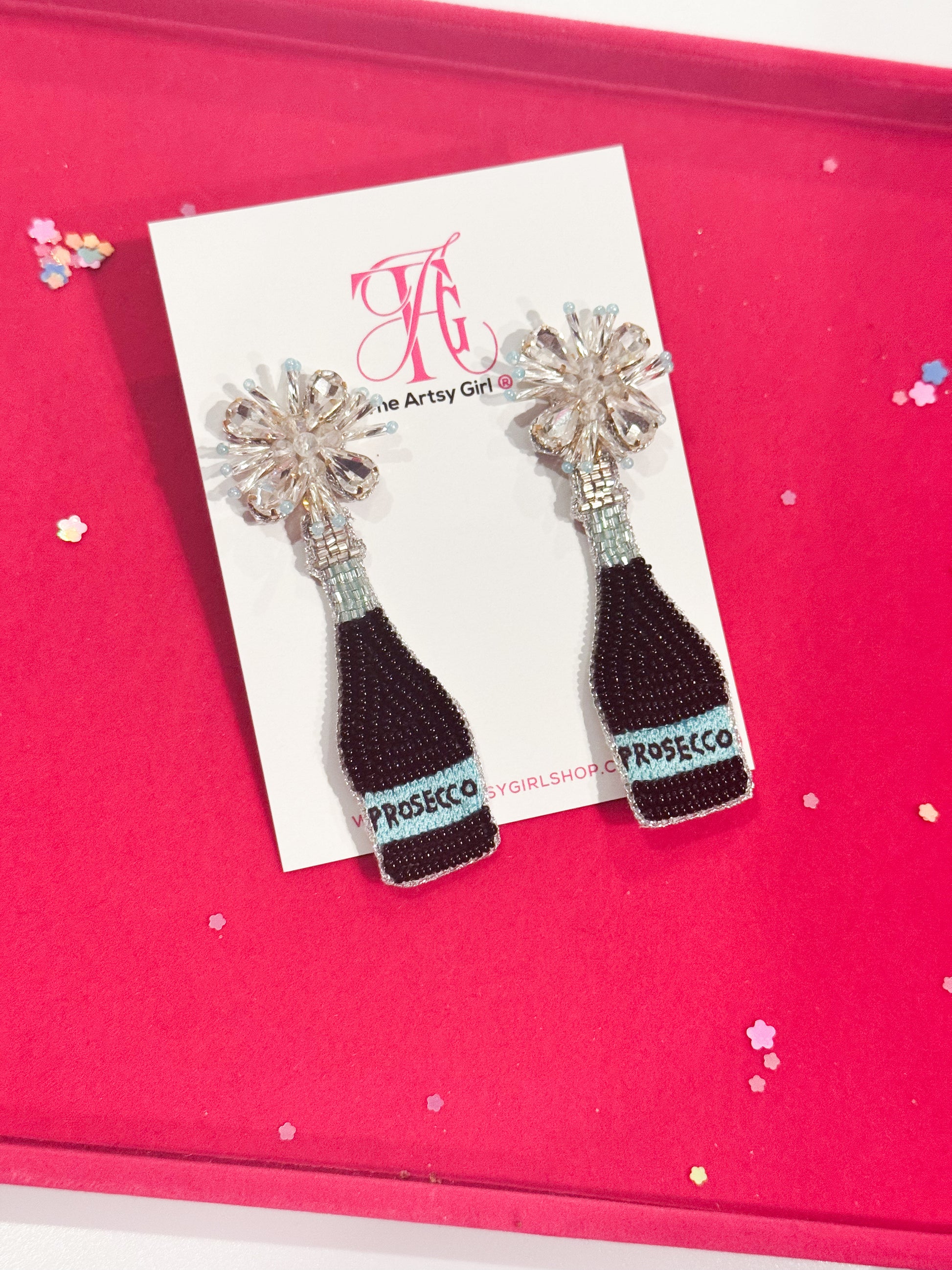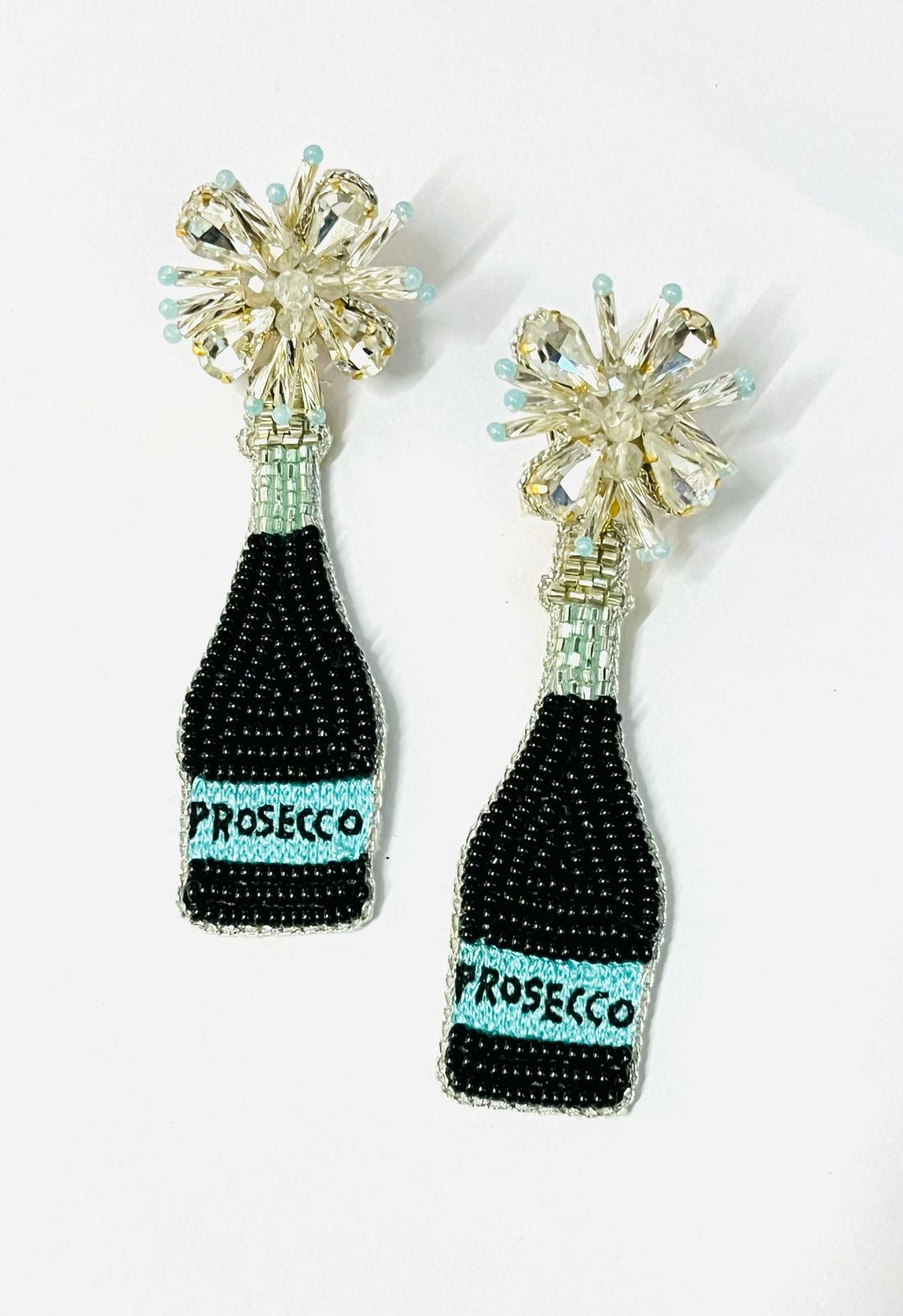 Cheers to style that pops! Our Poppin’ Sparkles earrings bring the party wherever you go. Designed as dazzling beaded Prosecco bottles bursting with crystal “bubbles,” these earrings are the ultimate celebration accessory. Whether you’re toasting to a birthday, bachelorette, or just making everyday feel like a fête, these statement earrings are full of sparkle and personality. Lightweight yet eye-catching, they’re perfect for the girl who’s always the life of the party—and proud of it!