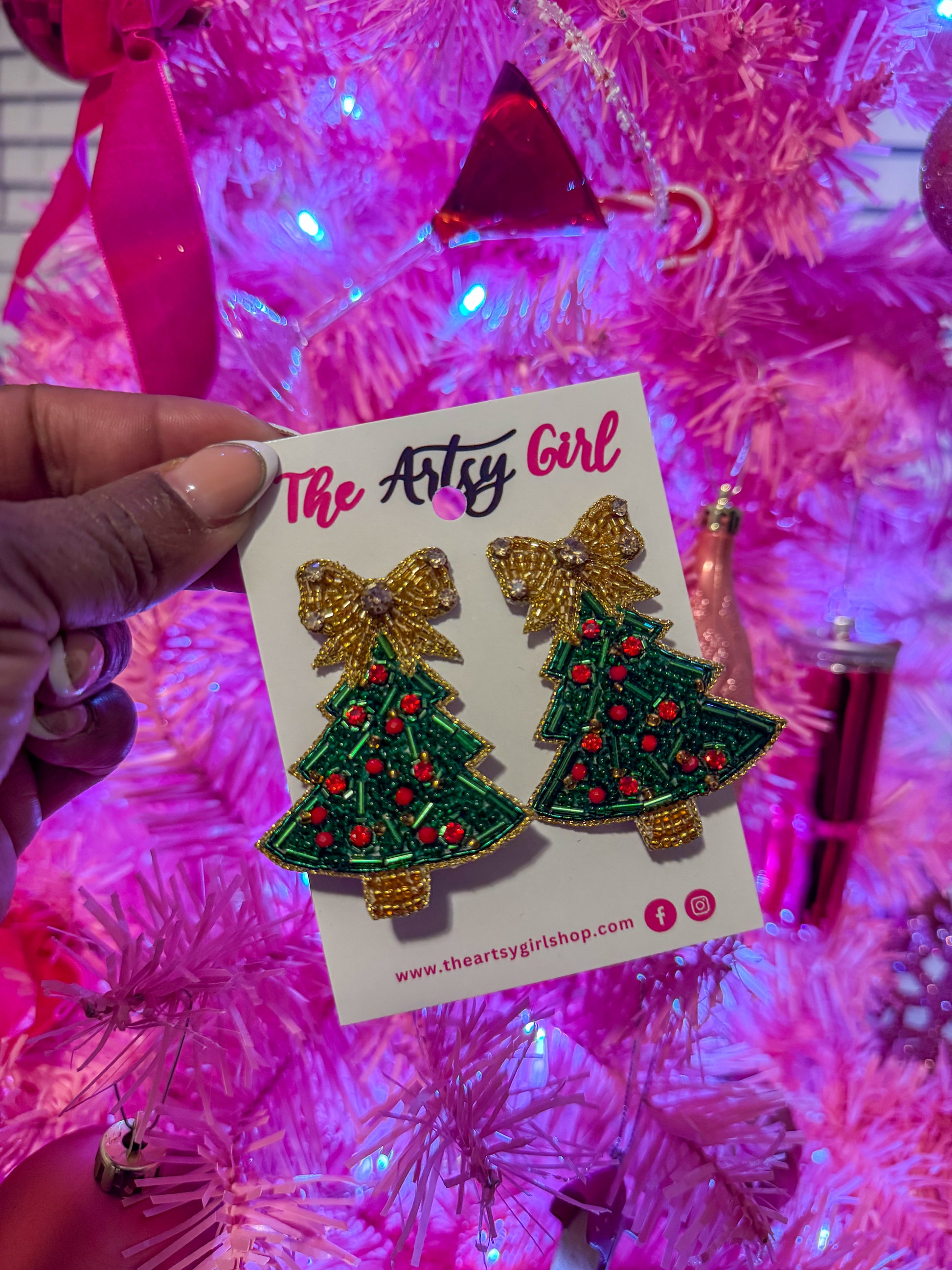Add festive sparkle to your holiday style with these handcrafted beaded Christmas tree earrings. Featuring shimmering beads, gold detailing, and a glittery bow topper, these lightweight statement earrings bring the perfect mix of holiday cheer and girly glam.
