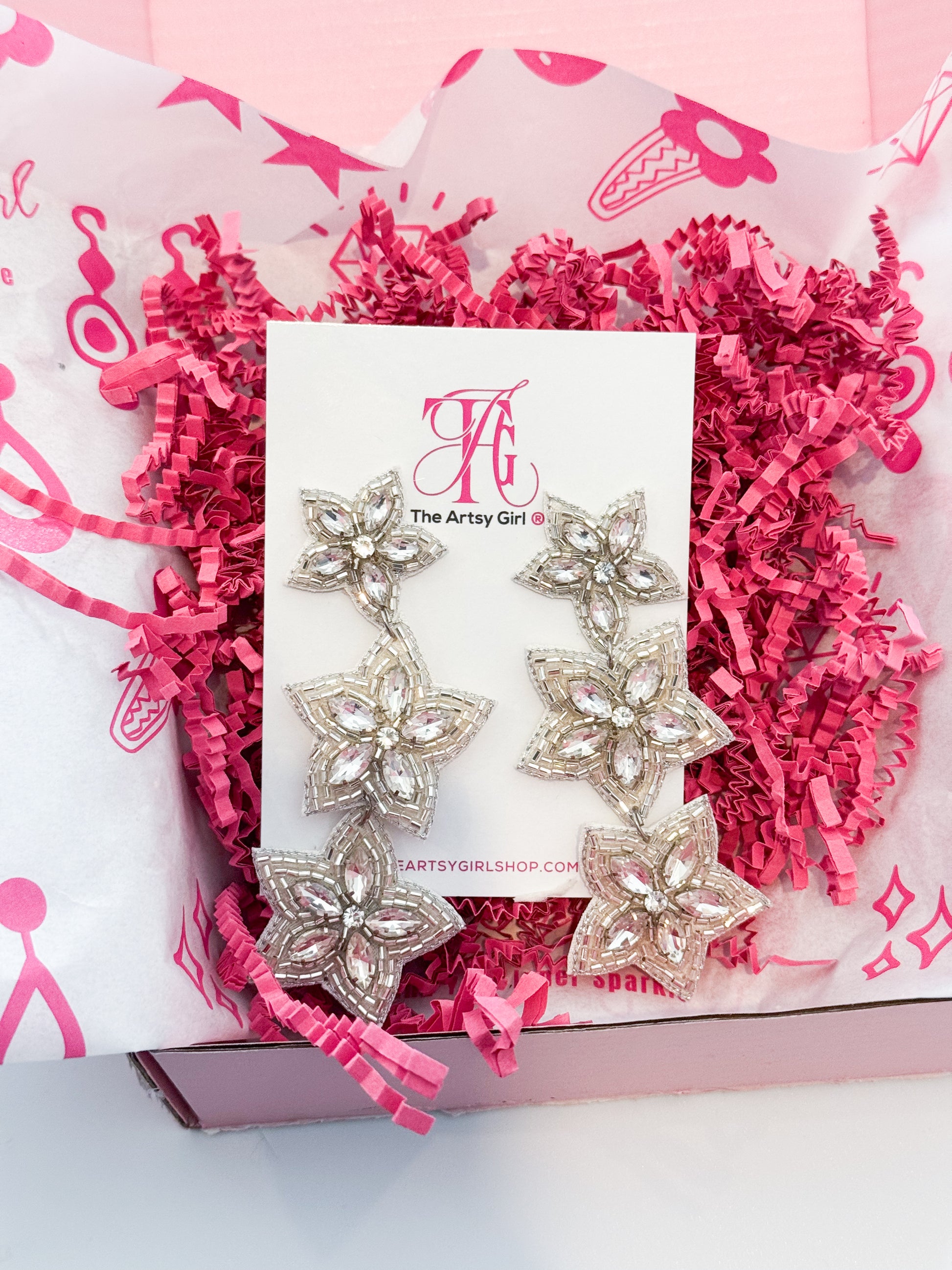 Turn heads and catch the light from every angle with our Star Gazing Sparkles Earrings. Featuring three cascading floral stars, these statement earrings are handcrafted with shimmering baguette and marquise-cut crystals set in intricate silver beading. Lightweight yet full of glam, they’re perfect for special occasions, Beyoncé concerts, or anytime you’re ready to shine with serious sparkle energy.